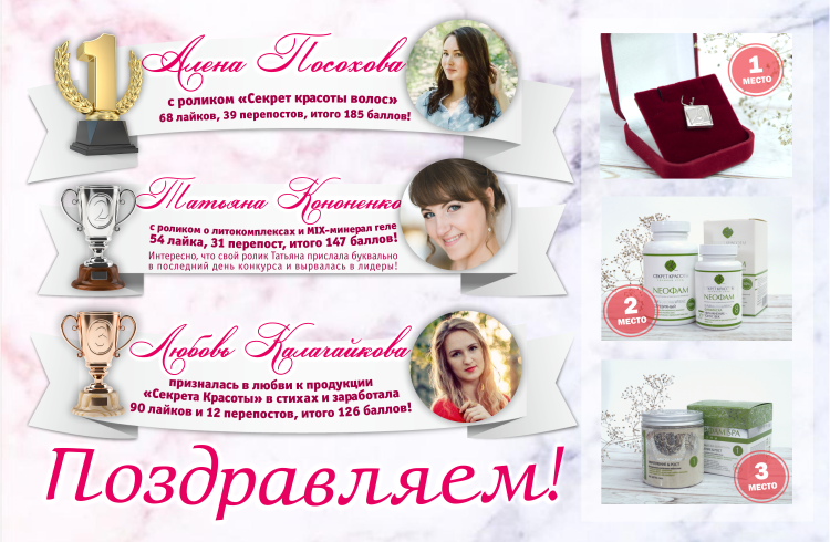 - 3 место Любовь Калачайкова призналась в любви к продукции «Секрета Красоты» в стихах и заработала 90 лайков и 12 перепостов, итого 126 баллов.