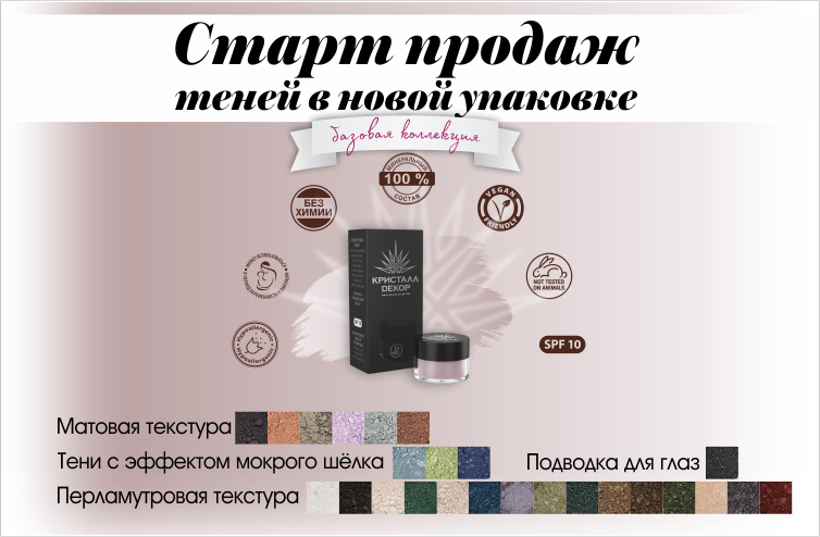 Дорогие Клиенты, Партнеры и Консультанты, рады Вам сообщить, что базовые оттенки теней «Кристалл Dекор»  и подводка для глаз теперь доступны к заказу в новой, стильной дизайнерской упаковке!