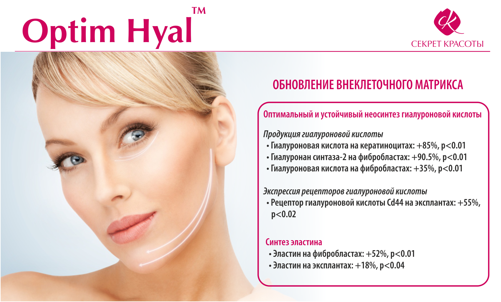 Мы давно сотрудничаем с европейскими компаниями, которые также занимаются научными разработками более высокого уровня и класса. И сегодня мы рады Вам сообщить, что результатом такой коллаборации стали наши «Леди Роял Кремы» с добавлением нового высокоэффективного компонента OPTIM HYAL™.