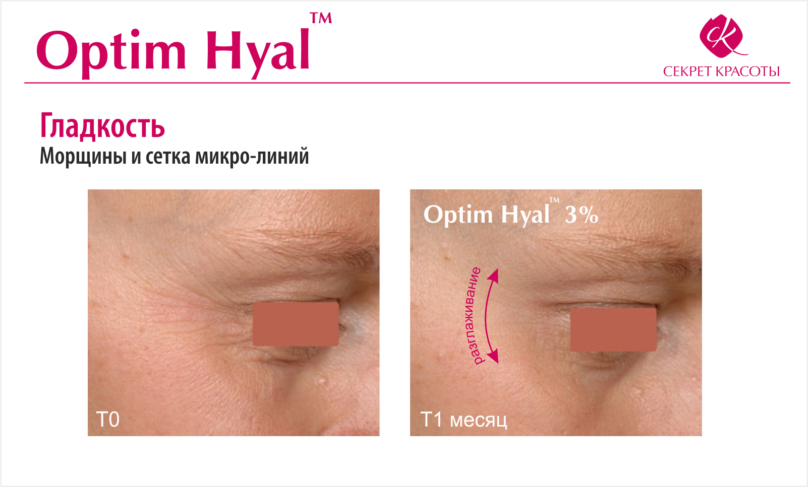 - Мелкоморщинистая сетка, возрастные изменения - OPTIM HYAL™ реально сглаживает морщинки (не маскирует, а естественным образом разглаживает за счёт восстановление и выработки естественной гиалуроновой кислоты).